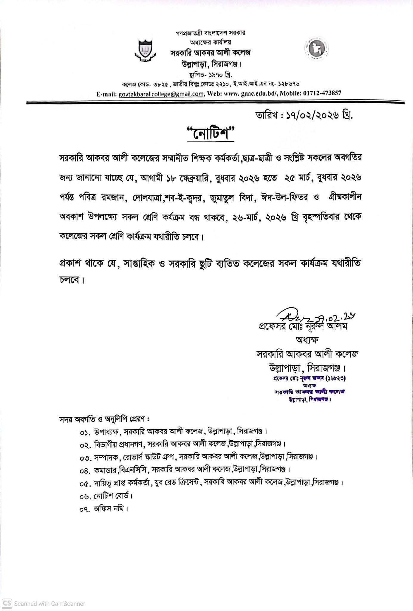 পবিত্র রমজান উপলক্ষ্যে উভয় শ্রেণির ক্লাস বন্ধ সংক্রান্ত বিজ্ঞপ্তি